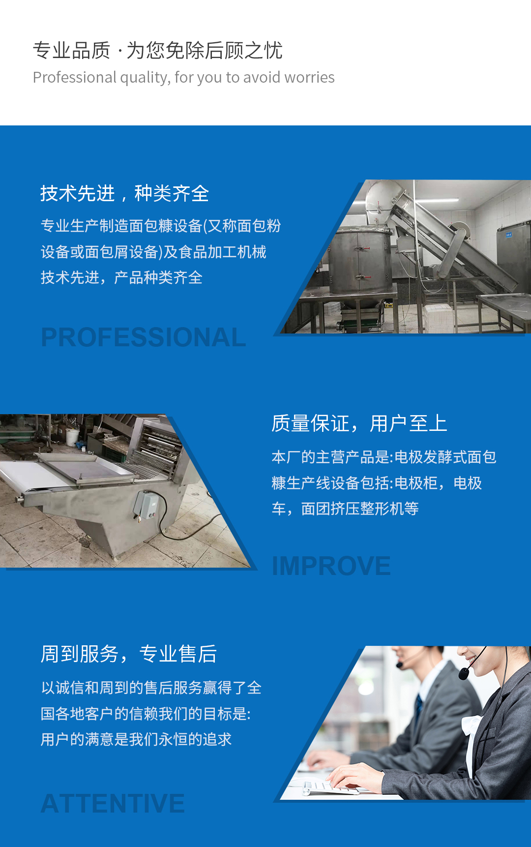 我厂是专业生产制造食品加工机械的企业。产品种类齐全,是食品加工企业的理想合作伙伴。我厂以诚信和周到的售后服务赢得了全国各地客户的信赖,产品远销山东、北京、广东、浙江、上海、及东北等地区。   本厂的主营产品是:电极发酵式面包糠生产线设备;...